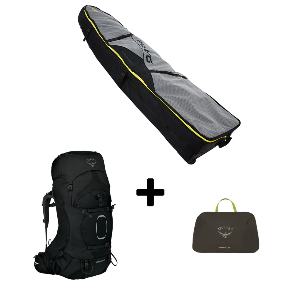 Dakine Quad + Osprey 65L backpack + Osprey vliegtuighoes: