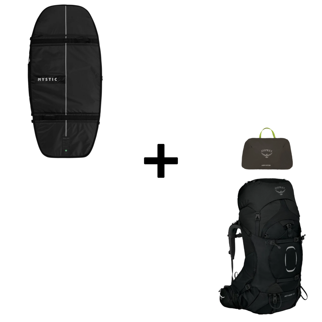 Mystic Saga Foil + Osprey 65L backpack + Osprey vliegtuighoes:
